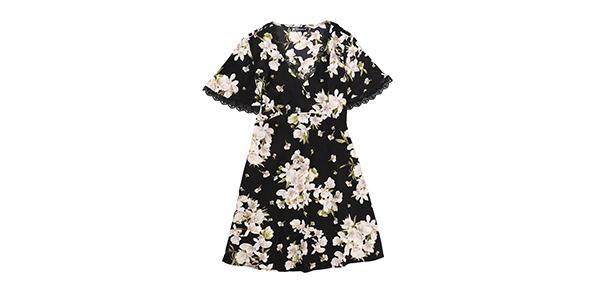 レーシートリムは花柄のVネックと完璧に磨かれたドレスを際立たせます。