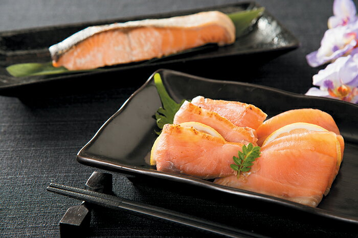 塩切身と日高の広葉樹で燻製したスモークサーモン、炙り焼きサーモンの3種セットです。